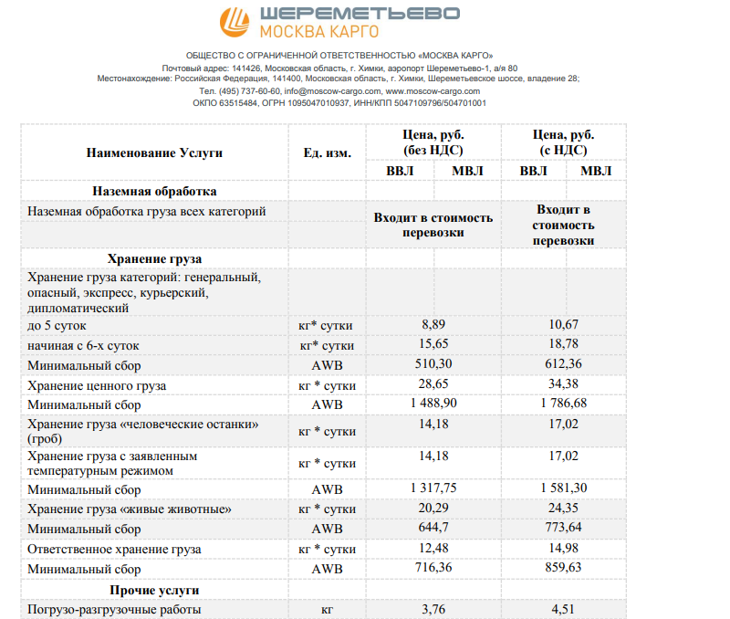 ООО «Москва Карго» оказывает полный комплекс услуг по наземному обслуживанию грузов и почты на рейсах