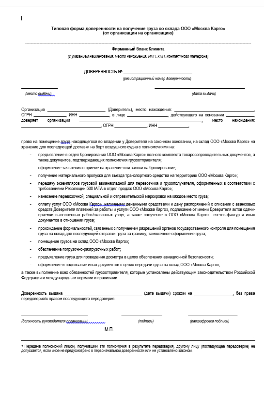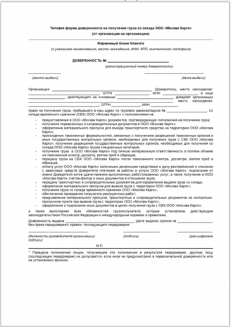 Доверенность на сдачу/получение груза от юридического лица (постоянная)