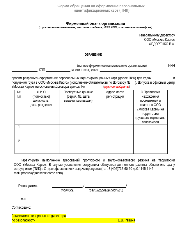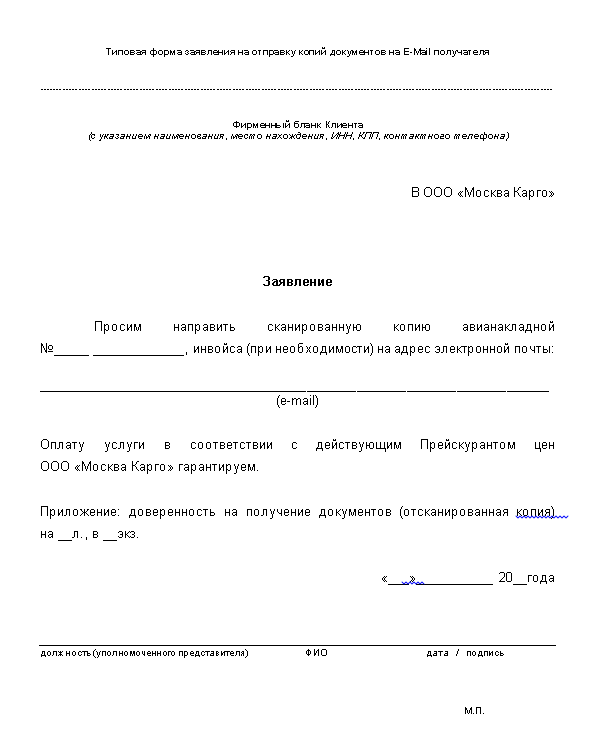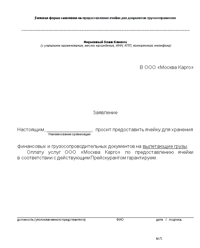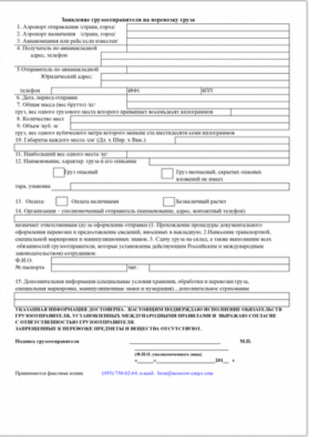 Заявление грузоотправителя на перевозку груза
