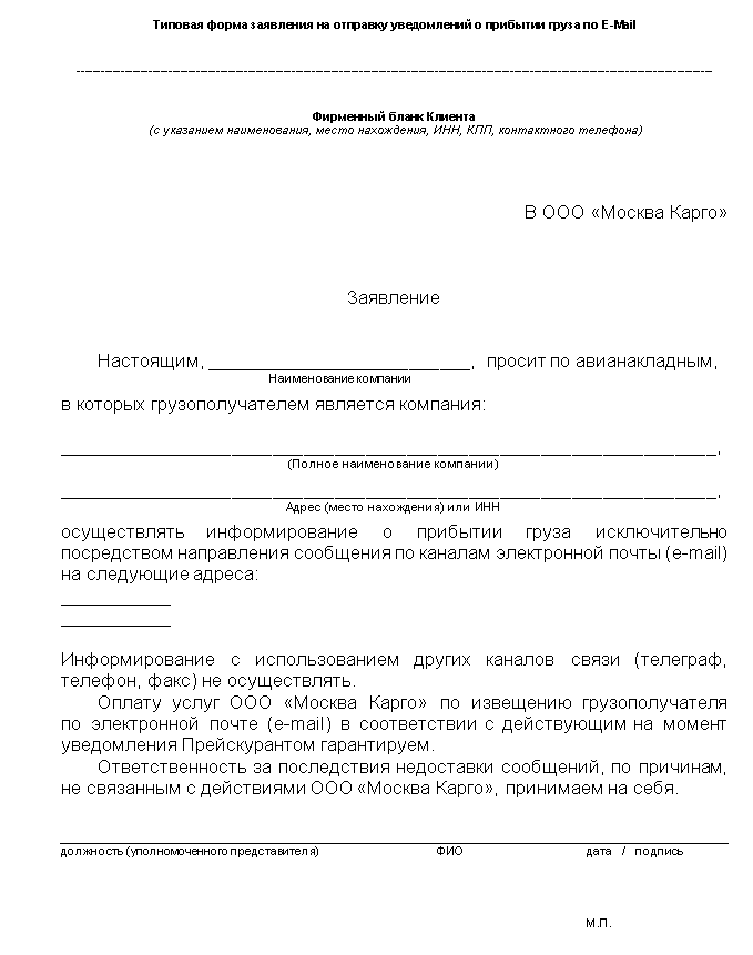 ЗАЯВЛЕНИЕ НА ОТПРАВКУ УВЕДОМЛЕНИЙ О ПРИБЫТИИ ГРУЗА ПО E-MAIL